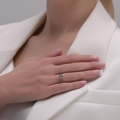 Кольцо с 1 бриллиантом природным, 1 карат, огранка круг 57 граней, цвет 5, чистота 7, тип огранки А; 3 бриллиантами природными, 0.03 карат, огранка круг 57 граней, цвет 3, чистота 6, тип огранки А; 13 бриллиантами природными, 0.13 карат, огранка круг 57 граней, цвет 3, чистота 6, тип огранки А; Белое золото 750 пробы.