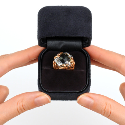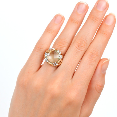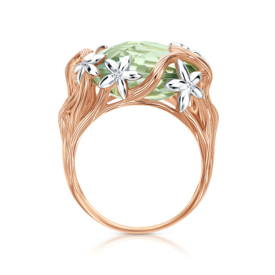 Кольцо с 7 бриллиантами природными, 0.014 карат, огранка круг 17 граней, цвет 2, чистота 2, тип огранки Б; 1 празиолитом природным, 10.517 карат; Розовое золото 585 пробы.