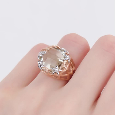 Кольцо с 7 бриллиантами природными, 0.01 карат, огранка круг 17 граней, цвет 2, чистота 2, тип огранки А; 1 празиолитом природным, 10.71 карат; Розовое золото 585 пробы.