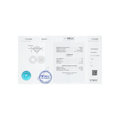 Кольцо с 1 бриллиантом природным, 1 карат, огранка круг 57 граней, цвет 4, чистота 5, тип огранки А; 10 бриллиантами природными, 0.3 карат, огранка круг 57 граней, цвет 3, чистота 6, тип огранки А; Белое золото 750 пробы.