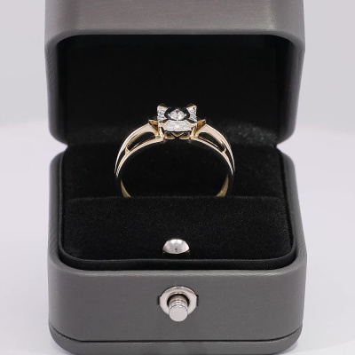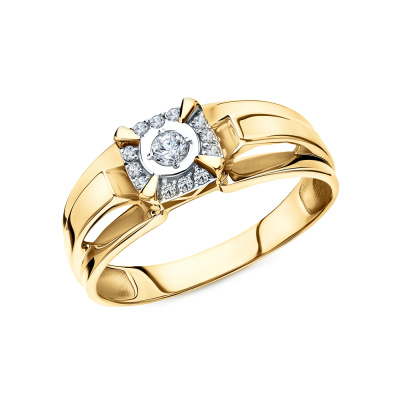 Кольцо с 1 бриллиантом, 0.083 карат, огранка круг 57 граней, цвет 3, чистота 6, тип огранки А; 12 бриллиантами, 0.089 карат, огранка круг 57 граней, цвет 3, чистота 6, тип огранки А; Желтое и белое золото 585 пробы.