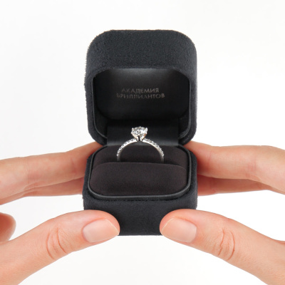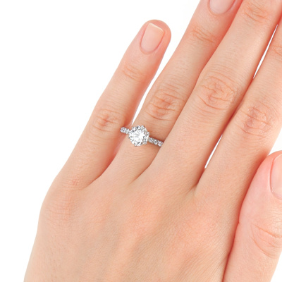 Кольцо с 1 бриллиантом природным, 1.2 карат, огранка круг 57 граней, цвет 5, чистота 5, тип огранки А; 14 бриллиантами природными, 0.16 карат, огранка круг 57 граней, цвет 3, чистота 6, тип огранки А; Платина 950 пробы.