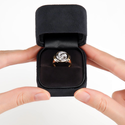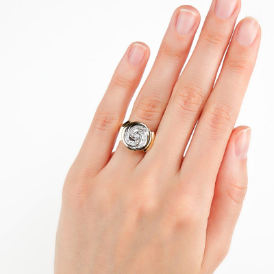 Кольцо с 1 бриллиантом, 0.059 карат, огранка круг 57 граней, цвет 3, чистота 6, тип огранки А; 33 бриллиантами, 0.114 карат, огранка круг 57 граней, цвет 3, чистота 6, тип огранки А; Желтое и белое золото 585 пробы.