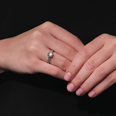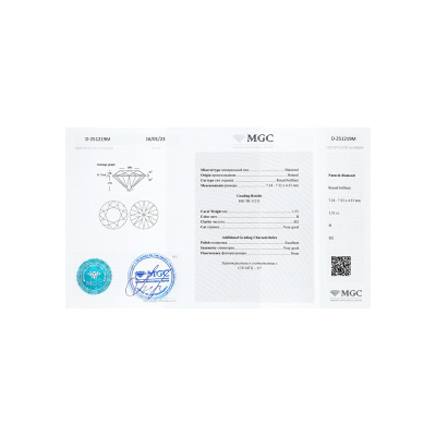 Кольцо с 1 бриллиантом природным, 1.51 карат, огранка круг 57 граней, цвет 5, чистота 7, тип огранки А; 12 бриллиантами природными, 0.36 карат, огранка круг 57 граней, цвет 3, чистота 6, тип огранки А; Белое золото 750 пробы.
