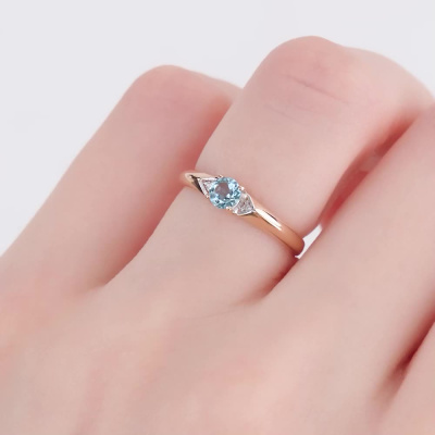 Кольцо с 2 бриллиантами природными, 0.008 карат, огранка круг 17 граней, цвет 2, чистота 2, тип огранки А; 1 топазом свисс природным, 0.28 карат, тип огранки В; Розовое золото 585 пробы.