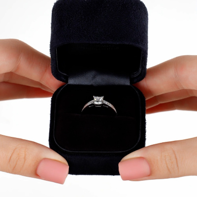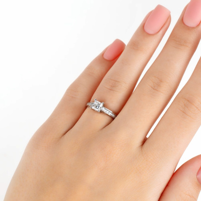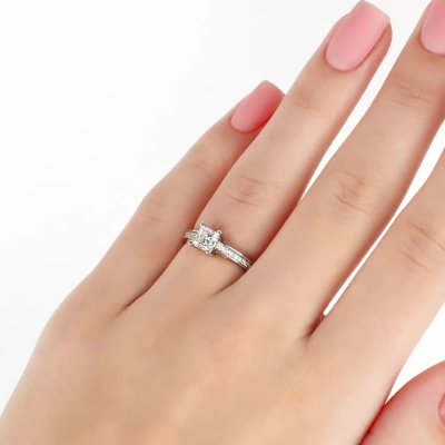 Кольцо с 1 бриллиантом природным, 0.7 карат, огранка принцесса 65 граней, цвет 2, чистота 3, тип огранки А; 18 бриллиантами природными, 0.13 карат, огранка круг 57 граней, цвет 3, чистота 6, тип огранки А; Платина 950 пробы.