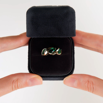 Кольцо с 3 гидротермальными изумрудами, 1.52 карат; Желтое золото 585 пробы.