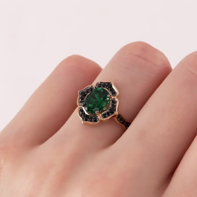 Кольцо с 1 гидротермальным изумрудом, 1.15 карат, тип огранки Б; 30 шпинелями черными природными, тип огранки В; 8 шпинелями черными природными, тип огранки В; Розовое золото 585 пробы.