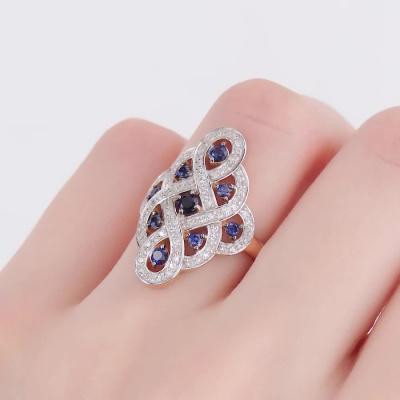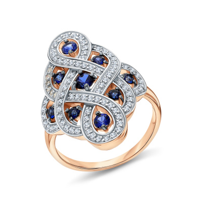 Кольцо с 1 сапфиром синтетическим, 0.14 карат, тип огранки В; 2 сапфирами синтетическими, 0.16 карат, тип огранки В; 6 сапфирами синтетическими, 0.26 карат, тип огранки В; 86 бриллиантами, 0.3 карат, огранка круг 17 граней, цвет 2, чистота 2, тип огранки А; Розовое золото 585 пробы.