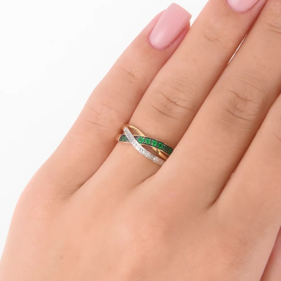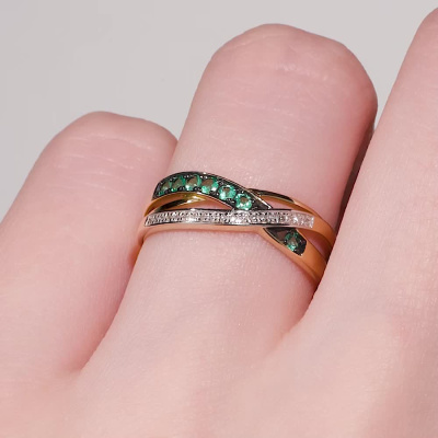 Кольцо с 19 бриллиантами природными, 0.03 карат, огранка круг 17 граней, цвет 2, чистота 2, тип огранки Б; 7 изумрудами природными, 0.12 карат, цвет 3, чистота 3, тип огранки В; Желтое золото 585 пробы.
