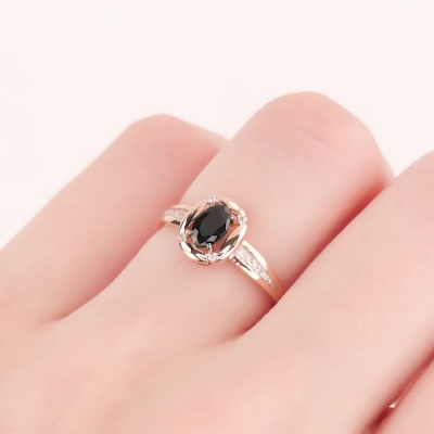 Кольцо с 14 бриллиантами природными, 0.03 карат, огранка круг 57 граней, цвет 4, чистота 5, тип огранки А; 1 сапфиром природным, 0.57 карат, цвет 2, чистота 2, тип огранки Б; Розовое золото 585 пробы.