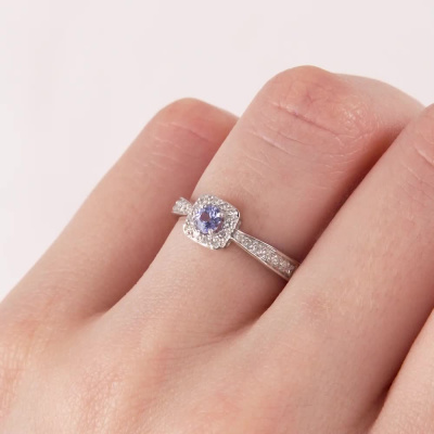 Кольцо с 10 бриллиантами природными, 0.06 карат, огранка круг 17 граней, цвет 2, чистота 2, тип огранки Б; 16 бриллиантами природными, 0.06 карат, огранка круг 17 граней, цвет 2, чистота 2, тип огранки Б; 1 танзанитом природным, 0.18 карат; Белое золото 585 пробы.