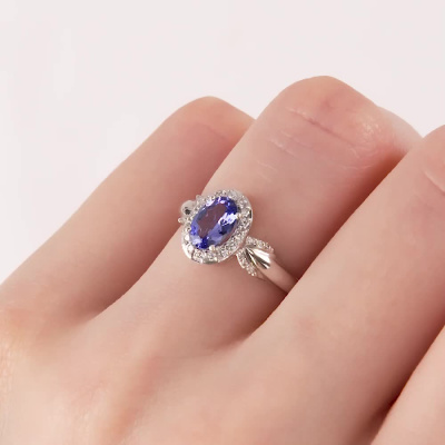 Кольцо с 16 бриллиантами природными, 0.11 карат, огранка круг 57 граней, цвет 4, чистота 5, тип огранки А; 12 бриллиантами природными, 0.02 карат, огранка круг 57 граней, цвет 4, чистота 5, тип огранки А; 1 танзанитом природным, 0.75 карат; Белое золото 585 пробы.