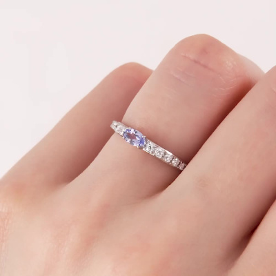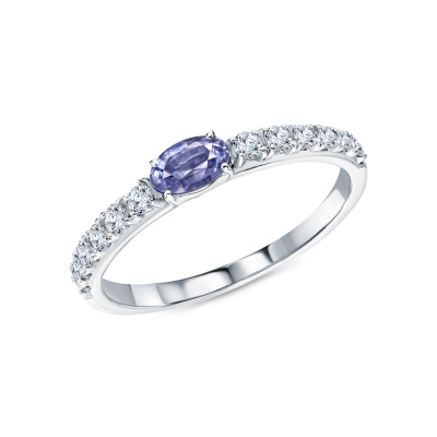 Кольцо с 4 бриллиантами природными, 0.09 карат, огранка круг 57 граней, цвет 3, чистота 6, тип огранки А; 4 бриллиантами природными, 0.06 карат, огранка круг 57 граней, цвет 3, чистота 6, тип огранки А; 4 бриллиантами природными, 0.03 карат, огранка круг 57 граней, цвет 3, чистота 6, тип огранки А; 1 танзанитом природным, 0.25 карат; Белое золото 585 пробы.
