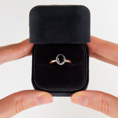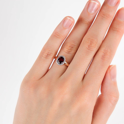 Кольцо с 20 бриллиантами природными, 0.08 карат, огранка круг 17 граней, цвет 2, чистота 2, тип огранки А; 1 гранатом природным, 0.93 карат; Розовое золото 585 пробы.