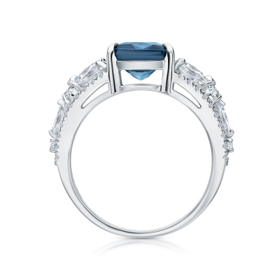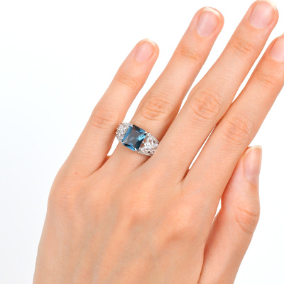 Кольцо с 40 бриллиантами природными, 0.14 карат, огранка круг 17 граней, цвет 2, чистота 2, тип огранки А; 1 топазом лондон природным, 3.67 карат; 4 сапфирами бесцветными природными, 0.61 карат; 2 сапфирами бесцветными природными, 0.18 карат; 4 сапфирами бесцветными природными, 0.23 карат; 4 сапфирами бесцветными природными, 0.08 карат; Белое золото 585 пробы.
