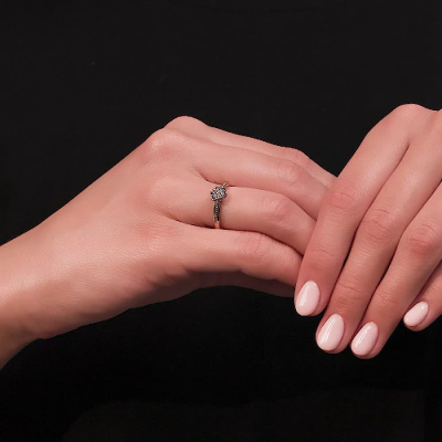 Кольцо с 1 бриллиантом, 0.02 карат, огранка круг 57 граней, цвет 3, чистота 6, тип огранки А; 6 бриллиантами, 0.08 карат, огранка круг 57 граней, цвет 3, чистота 6, тип огранки А; 18 бриллиантами, 0.03 карат, огранка круг 17 граней, цвет 2, чистота 2, тип огранки А; Розовое и белое золото 585 пробы.