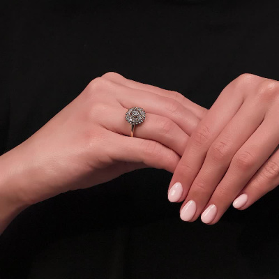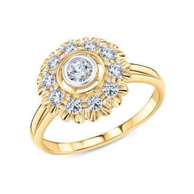 Кольцо с 1 бриллиантом природным, 0.19 карат, огранка круг 57 граней, цвет 3, чистота 6, тип огранки А; 10 бриллиантами природными, 0.47 карат, огранка круг 57 граней, цвет 3, чистота 6, тип огранки А; Желтое золото 585 пробы.