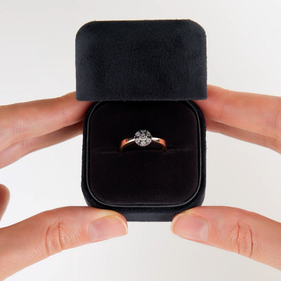 Кольцо с 3 бриллиантами природными, 0.02 карат, огранка круг 57 граней, цвет 3, чистота 6, тип огранки А; 6 бриллиантами природными, 0.01 карат, огранка круг 17 граней, цвет 2, чистота 2, тип огранки А; Розовое и белое золото 585 пробы.