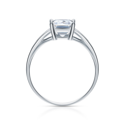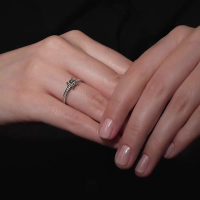 Кольцо с 1 бриллиантом природным, 1 карат, огранка принцесса 65 граней, цвет 2, чистота 6, тип огранки А; 16 бриллиантами природными, 0.2 карат, огранка круг 57 граней, цвет 3, чистота 6, тип огранки А; Белое золото 585 пробы.
