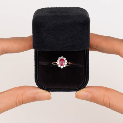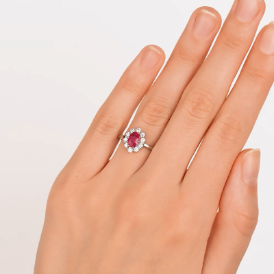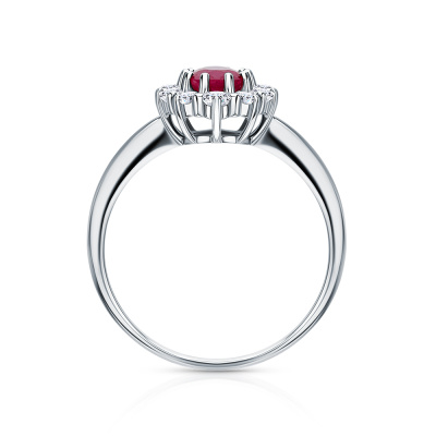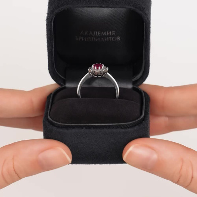 Кольцо с 10 бриллиантами природными, 0.39 карат, огранка круг 57 граней, цвет 3, чистота 6, тип огранки А; 1 рубином природным, 0.94 карат, цвет 2, чистота 2, тип огранки Б; Белое золото 585 пробы.