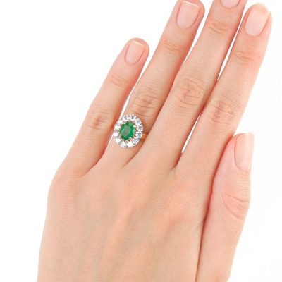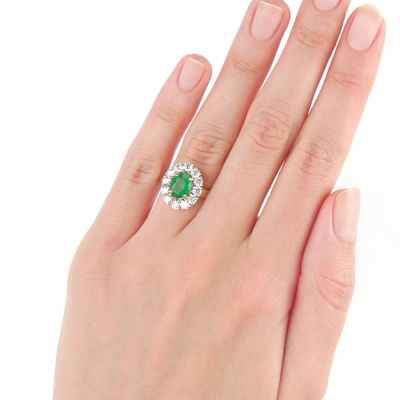 Кольцо с 12 бриллиантами природными, 0.955 карат, огранка круг 57 граней, цвет 4, чистота 6; 1 изумрудом природным, 0.945 карат, цвет 3, чистота 3; Желтое золото 585 пробы.