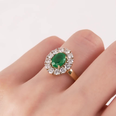 Кольцо с 12 бриллиантами природными, 1.05 карат, огранка круг 57 граней, цвет 4, чистота 6, тип огранки А; 1 изумрудом природным, 1.15 карат, цвет 3, чистота 3, тип огранки Б; Желтое золото 585 пробы.