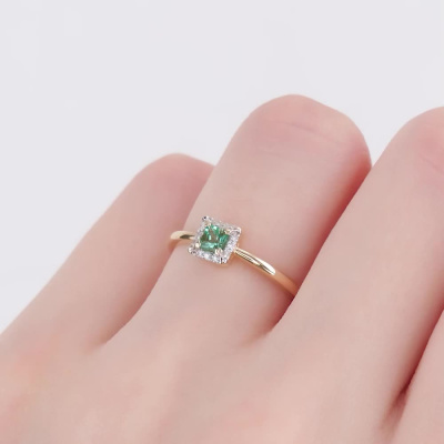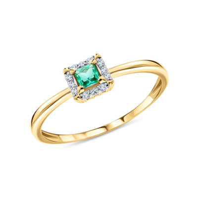 Кольцо с 12 бриллиантами природными, 0.04 карат, огранка круг 17 граней, цвет 2, чистота 2, тип огранки А; 1 изумрудом природным, 0.13 карат, цвет 3, чистота 3, тип огранки Б; Желтое золото 585 пробы.