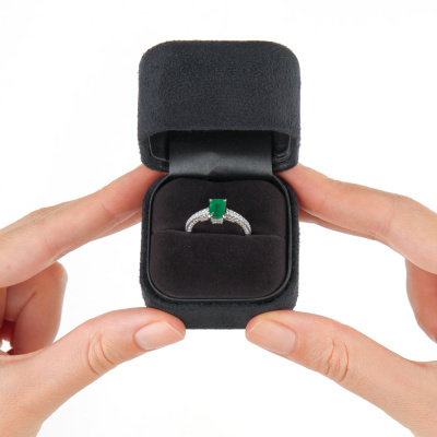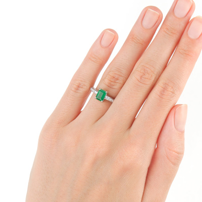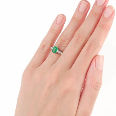 Кольцо с 34 бриллиантами природными, 0.35 карат, огранка круг 57 граней, цвет 3, чистота 6, тип огранки А; 68 бриллиантами природными, 0.49 карат, огранка круг 57 граней, цвет 3, чистота 6, тип огранки А; 10 бриллиантами природными, 0.04 карат, огранка круг 57 граней, цвет 3, чистота 6, тип огранки А; 22 бриллиантами природными, 0.04 карат, огранка круг 57 граней, цвет 3, чистота 6, тип огранки А; 1 изумрудом природным, 0.93 карат, цвет 3, чистота 3, тип огранки Б; Белое золото 585 пробы.
