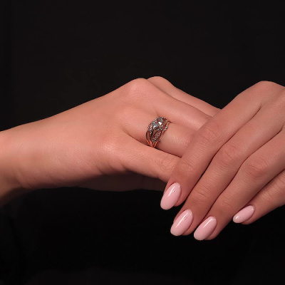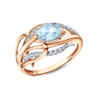 Кольцо с 1 топазом скай природным, 0.92 карат; 19 топазами бесцветными природными, 0.19 карат; 5 топазами бесцветными природными, 0.03 карат; Розовое золото 585 пробы.