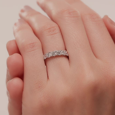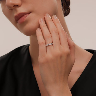 Кольцо с 7 бриллиантами выращенными, 0.75 карат, огранка круг 57 граней, цвет 3, чистота 5, тип огранки А; Белое золото 585 пробы.