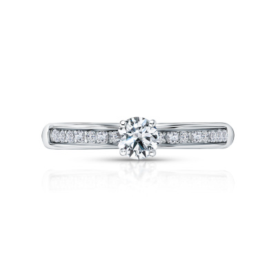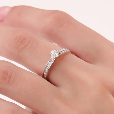 Кольцо с 1 бриллиантом выращенным, 0.33 карат, огранка круг 57 граней, цвет 4, чистота 5, тип огранки А; 18 бриллиантами выращенными, 0.13 карат, огранка круг 57 граней, цвет 3, чистота 5, тип огранки А; Белое золото 585 пробы.