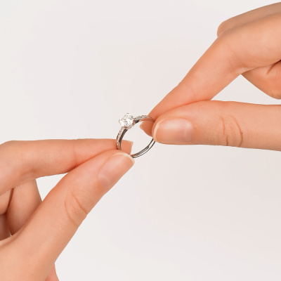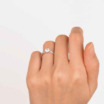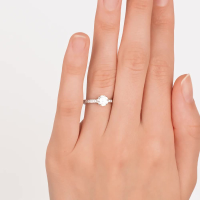 Кольцо с 1 бриллиантом выращенным, 0.72 карат, огранка круг 57 граней, цвет 4, чистота 5, тип огранки А; 18 бриллиантами выращенными, 0.13 карат, огранка круг 57 граней, цвет 3, чистота 5, тип огранки А; Белое золото 585 пробы.