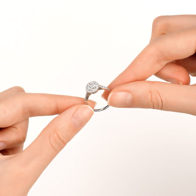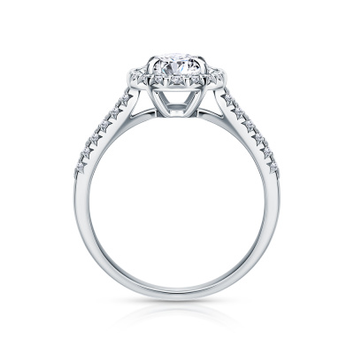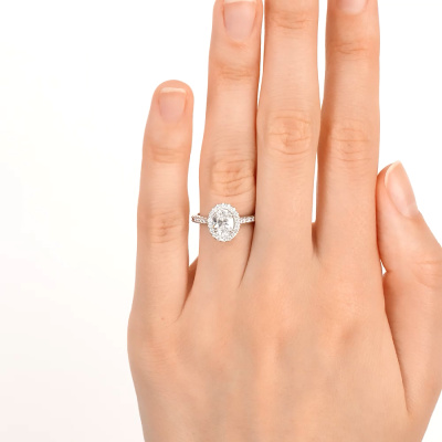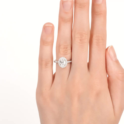Кольцо с 1 бриллиантом выращенным, 0.85 карат, огранка овал 57 граней, цвет 3, чистота 5, тип огранки А; 30 бриллиантами выращенными, 0.21 карат, огранка круг 57 граней, цвет 3, чистота 6, тип огранки А; Белое золото 585 пробы.
