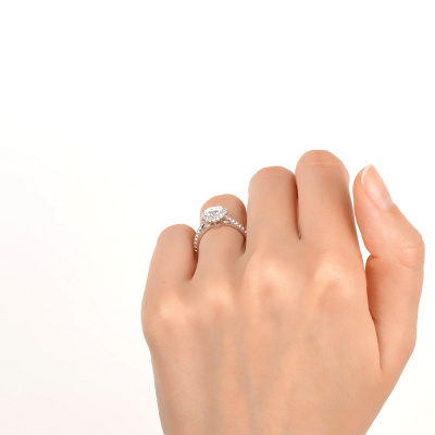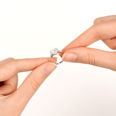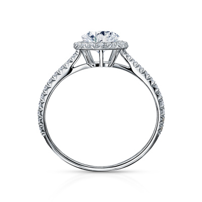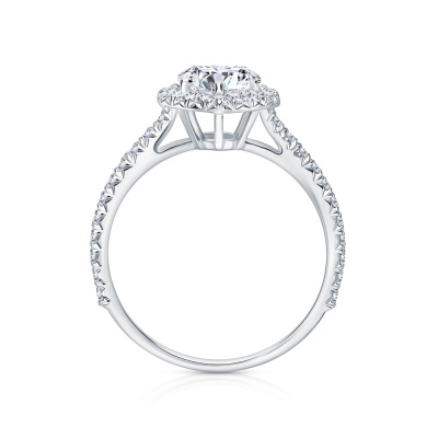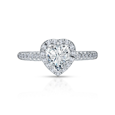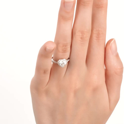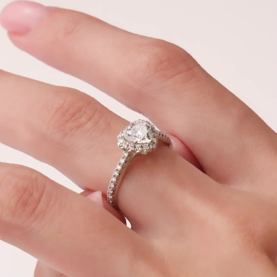 Кольцо с 1 бриллиантом выращенным, 0.66 карат, огранка сердце 57 граней, цвет 3, чистота 5, тип огранки А; 37 бриллиантами выращенными, 0.26 карат, огранка круг 57 граней, цвет 3, чистота 6, тип огранки А; Белое золото 585 пробы.