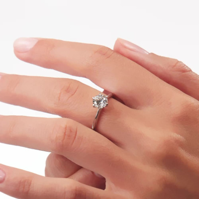 Кольцо с 1 бриллиантом выращенным, 0.96 карат, огранка круг 57 граней, цвет 4, чистота 6, тип огранки А; Белое золото 585 пробы.