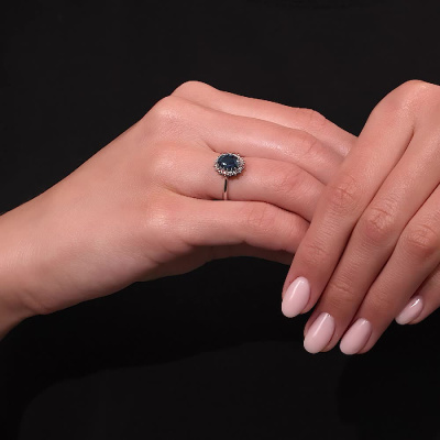 Кольцо с 16 бриллиантами природными, 0.3 карат, огранка круг 57 граней, цвет 4, чистота 5, тип огранки А; 1 сапфиром природным, 1.48 карат, цвет 2, чистота 2, тип огранки Б; Белое золото 585 пробы.