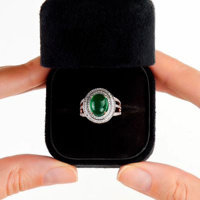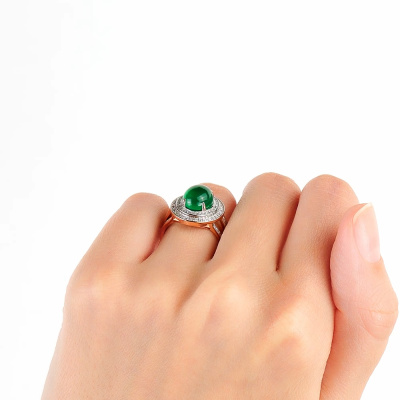 Кольцо с 112 бриллиантами природными, 0.28 карат, огранка круг 17 граней, цвет 2, чистота 2, тип огранки А; 1 агатом зеленым природным; Розовое золото 585 пробы.