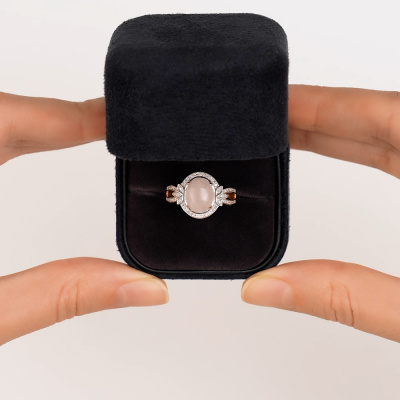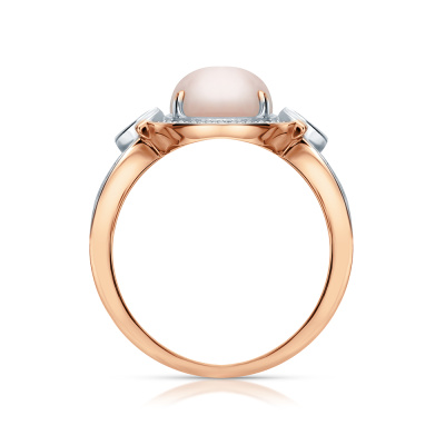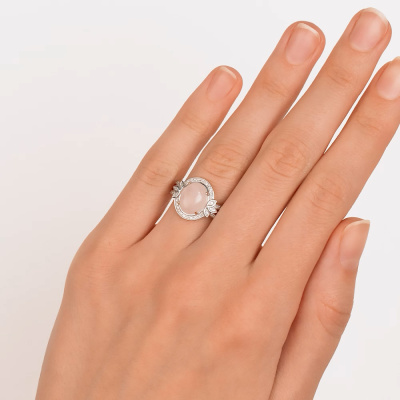 Кольцо с 54 бриллиантами природными, 0.12 карат, огранка круг 17 граней, цвет 2, чистота 2, тип огранки А; 1 кварцем розовым природным, 2.47 карат; Розовое золото 585 пробы.