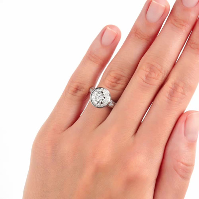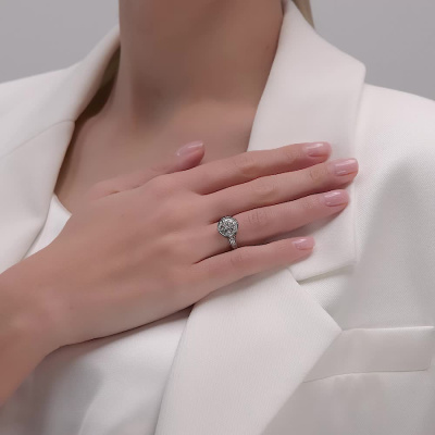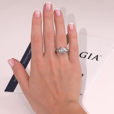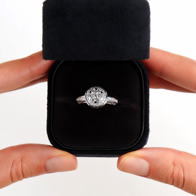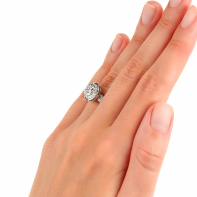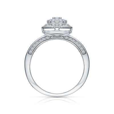 Кольцо с 1 бриллиантом природным, 0.07 карат, огранка круг 57 граней, цвет 3, чистота 6, тип огранки А; 6 бриллиантами природными, 0.32 карат, огранка круг 57 граней, цвет 3, чистота 6, тип огранки А; 60 бриллиантами природными, 0.36 карат, огранка круг 57 граней, цвет 3, чистота 6, тип огранки А; Белое золото 585 пробы.