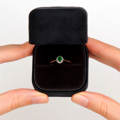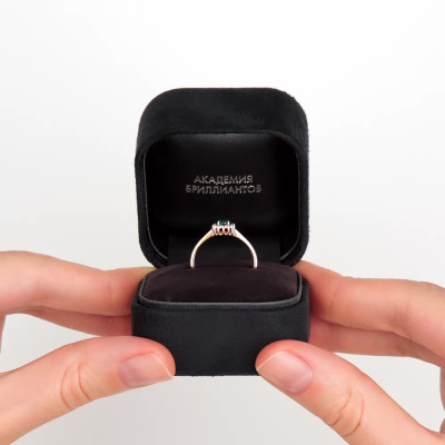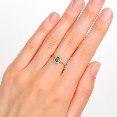 Кольцо с 14 бриллиантами природными, 0.03 карат, огранка круг 17 граней, цвет 2, чистота 2, тип огранки А; 1 изумрудом природным, 0.3 карат, цвет 3, чистота 3, тип огранки Б; Розовое золото 585 пробы.