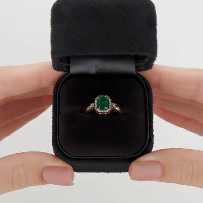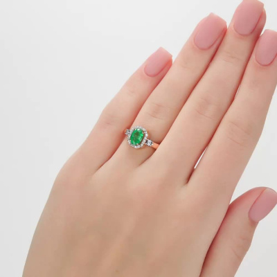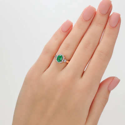 Кольцо с 2 бриллиантами природными, 0.01 карат, огранка круг 17 граней, цвет 2, чистота 2, тип огранки А; 22 бриллиантами природными, 0.07 карат, огранка круг 17 граней, цвет 2, чистота 2, тип огранки А; 1 изумрудом природным, 0.7 карат, цвет 3, чистота 3, тип огранки Б; Розовое и белое золото 585 пробы.