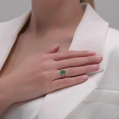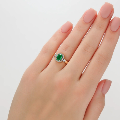 Кольцо с 2 бриллиантами природными, 0.01 карат, огранка круг 17 граней, цвет 2, чистота 2, тип огранки А; 22 бриллиантами природными, 0.07 карат, огранка круг 17 граней, цвет 2, чистота 2, тип огранки А; 1 изумрудом природным, 0.64 карат, цвет 3, чистота 3, тип огранки Б; Желтое и белое золото 585 пробы.