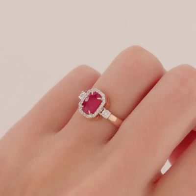 Кольцо с 2 бриллиантами природными, 0.01 карат, огранка круг 17 граней, цвет 2, чистота 2, тип огранки А; 22 бриллиантами природными, 0.07 карат, огранка круг 17 граней, цвет 2, чистота 2, тип огранки А; 1 рубином природным, 0.79 карат, цвет 2, чистота 2, тип огранки Б; Розовое золото 585 пробы.