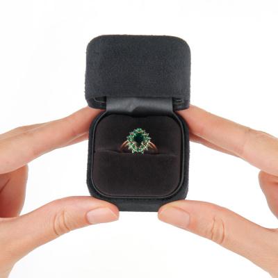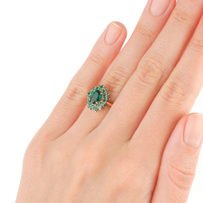 Кольцо с 1 гидротермальным изумрудом, 0.69 карат; 4 гидротермальными изумрудами, 0.17 карат; 8 гидротермальными изумрудами, 0.16 карат; 12 гидротермальными изумрудами, 0.15 карат; Розовое золото 585 пробы.