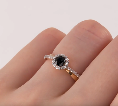 Кольцо с 8 бриллиантами природными, 0.05 карат, огранка круг 57 граней, цвет 3, чистота 6, тип огранки А; 24 бриллиантами природными, 0.09 карат, огранка круг 17 граней, цвет 2, чистота 2, тип огранки А; 1 сапфиром природным, 0.28 карат, цвет 2, чистота 2, тип огранки В; Розовое золото 585 пробы.