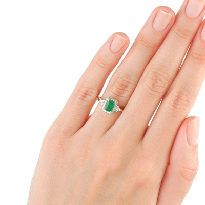 Кольцо с 6 бриллиантами природными, 0.08 карат, огранка круг 57 граней, цвет 3, чистота 6, тип огранки А; 20 бриллиантами природными, 0.06 карат, огранка круг 17 граней, цвет 2, чистота 2, тип огранки А; 1 изумрудом природным, 0.47 карат, цвет 3, чистота 3, тип огранки Б; Желтое золото 585 пробы.