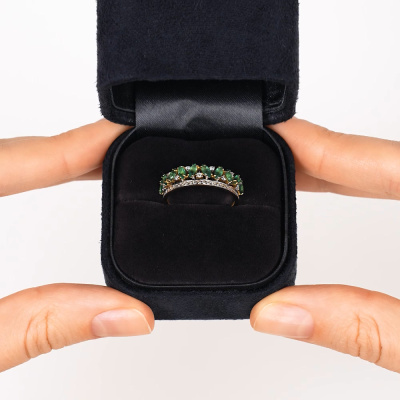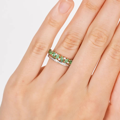 Кольцо с 9 бриллиантами природными, 0.06 карат, огранка круг 57 граней, цвет 3, чистота 6, тип огранки А; 25 бриллиантами природными, 0.08 карат, огранка круг 17 граней, цвет 2, чистота 2, тип огранки А; 10 изумрудами природными, 0.65 карат, цвет 3, чистота 3, тип огранки Б; Желтое золото 585 пробы.