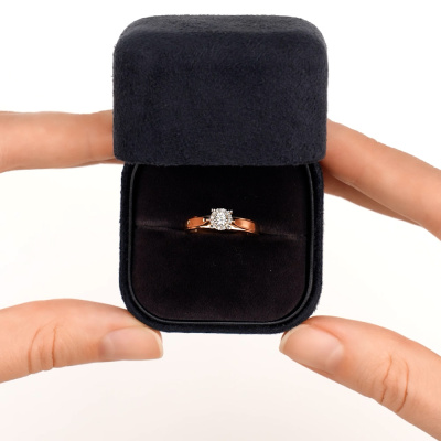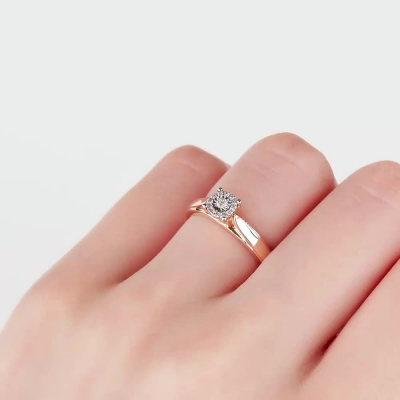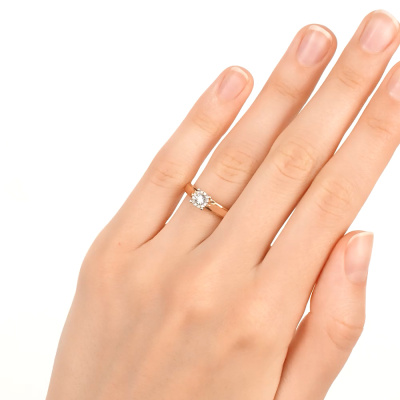 Кольцо с 1 бриллиантом природным, 0.03 карат, огранка круг 57 граней, цвет 4, чистота 5, тип огранки А; 12 бриллиантами природными, 0.03 карат, огранка круг 17 граней, цвет 2, чистота 2, тип огранки А; Розовое и белое золото 585 пробы.