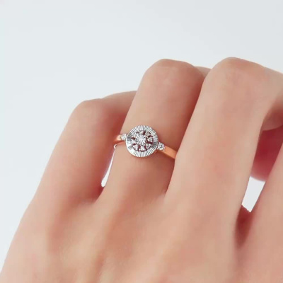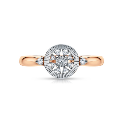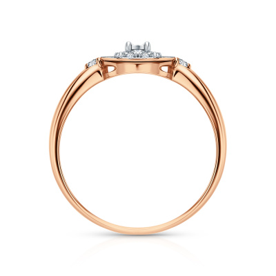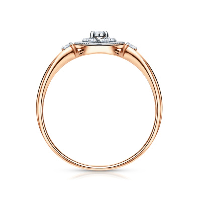 Кольцо с 2 бриллиантами природными, 0.02 карат, огранка круг 57 граней, цвет 3, чистота 6; 1 бриллиантом природным, 0.008 карат, огранка круг 57 граней, цвет 3, чистота 6; 8 бриллиантами природными, 0.03 карат, огранка круг 17 граней, цвет 2, чистота 2; Розовое и белое золото 585 пробы.